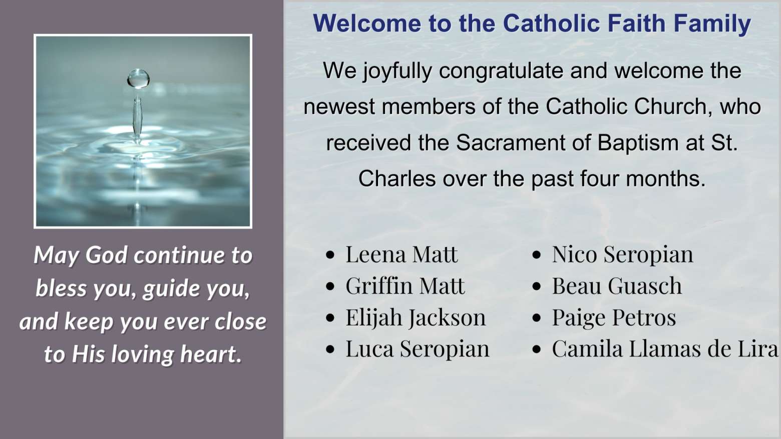 Anita, Ron, and Steve Pasch (and the SET team), Gary Stimmell, Diane Rinetti, Jeanine Builta, Marianne Kovacich, Phyllis Clearwater, Janet Schott, Linda Trame, Roy Cavellini, Darlene and Bob Murphy, the Pastoral Council, John Homa, and Vince Opipari.